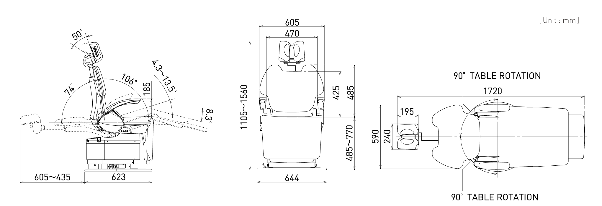 A chair-type operating table with the lowest position of 485 mm for patient’s sitting comfort. Converts to surgical position with a push of a programmable setting switch (PRESET switch). The height can also be adjusted within the 285 mm lifting stroke range. After surgery, the patient can be smoothly converted to a chair position with a single push of the programmable return switch(AUTO RETURN switch). Smooth and quiet operation due to hydraulic mechanism.